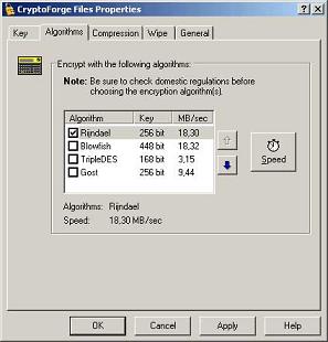 CryptoForge incluye potente compresión para reforzar aún más la seguridad criptográfica. Entre sus características únicas se incluyen la encriptación múltiple, encriptación de nombre de archivo, medidor de velocidad de los cifradores y almacenamiento temporal de la clave.